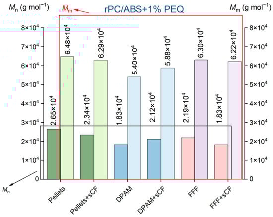 Figure 3 shows the number average molar mass (Mn) and mass average molar mass (Mm) of the rPC/ABS composites before and after processing via DPAM and FFF, as determined via GPC. Pellets with and without sCF, as processed via DPAM, were compared in the first stage, and an acceptable decrease was observed in Mn and Mm, with the Mn value decreasing by ca. 30% and the value of Mm decreasing by ca. 15% for the material without sCF, whereas the decrease is less pronounced (20% for Mn and 6% for Mm) in case of the material with sCF. In the second stage of FFF, the decrease in molar mass characteristics was even more acceptable for the material with sCF, as it experienced a ca. 20% drop for Mn and almost none for Mm. In both techniques, Mn was more affected during processing, indicating the formation of short oligomers.