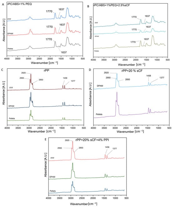 Figure 4A,B show the FTIR spectra of rPC/ABS and rPC/ABS/sCF composite pellets before processing and after 3D printing via DPAM and FFF. To evaluate the thermo-oxidative degradation, the signal of the C=C bond at 1637 cm−1 and the signal of the oxidation product’s carbonyl group at 1770 cm−1 were followed, as it is known that butadiene units in the structure of ABS are most prone to thermo-oxidative degradation [,]. The oxidation product’s C=O signal for ABS, however, overlaps with the signal of the carbonyl group of PC, complicating the analysis at first sight. The intensity of the latter can, fortunately, be considered constant, thus not affecting the analysis.