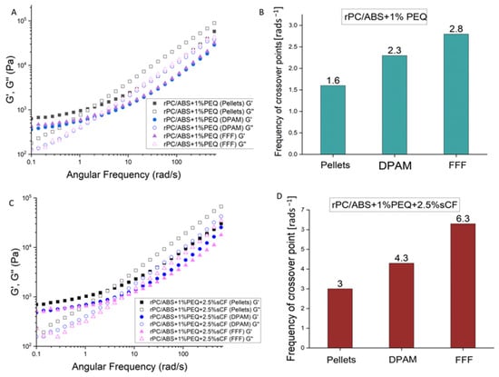 (A): G′, G″ vs. angular frequency of rPC/ABS + 1% PEQ: pellets, processed through DPAM and FFF. (B): Frequency of crossover points of rPC/ABS + 1% PEQ: pellets, processed through DPAM and FFF. (C): G′, G″ vs. angular frequency of rPC/ABS + 1% PEQ with sCF: pellets, processed through DPAM and FFF. (D): Frequency of crossover points of rPC/ABS + 1% PEQ with sCF: pellets, processed through DPAM and FFF.