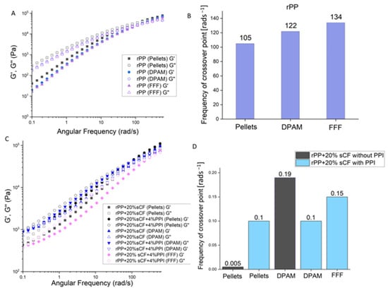 (A) G′, G″ vs. angular frequency of rPP: pellets, processed through DPAM and processed through FFF. (B): Frequency of crossover points of rPP: pellets, processed through DPAM and FFF. (C): G′, G″ vs. angular frequency of rPP with sCF and with sCF and PPI: pellets, processed through DPAM and processed through FFF. (D): Frequency of crossover points of rPP with sCF and with sCF and PPI: pellets, processed through DPAM and FFF.