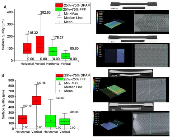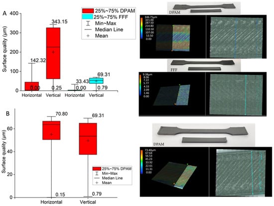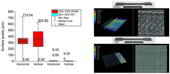 The surface quality of the printed parts was examined via optical microscopy in the horizontal and vertical directions. The entire surface was measured and the sample’s surface profile was traced using data obtained from the VK-X Series. Several methods can be used to quantify microscopic asperity; for example, one can find the level difference between the highest and lowest points within a 1 mm square area []. This height profile was used to compare the different printing techniques (DPAM and FFF) and the outcomes are included in Figure 7, Figure 8 and Figure 9. These results are displayed in a box plot, wherein the colored box represents the 25–75% height range and a T-shaped line indicates the maximum value. The minimum value is always recalculated to 0 µm to facilitate comparisons. The explicit value in the graph is the disparity between the highest and lowest peaks of the curve element along the sampling length.
