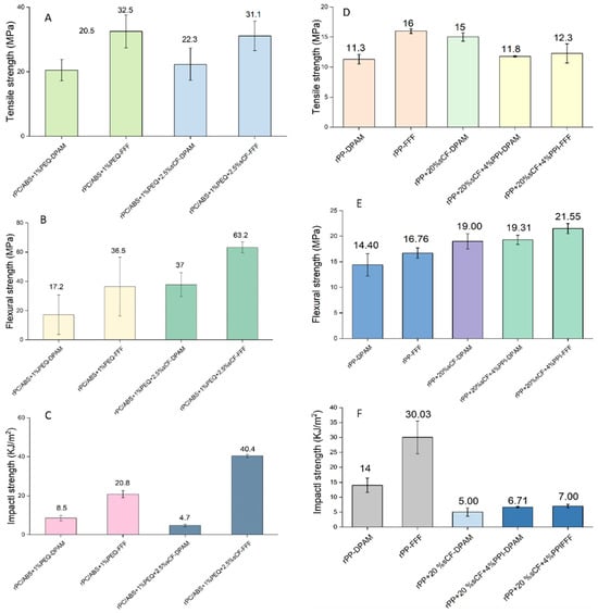 Finally, certain deviations between rPP parts with sCF and those without sCF are seen in Figure 10D,F. Composite parts demonstrated nearly similar tensile and flexural properties compared to parts with no sCF. However, the impact test outcomes show a decline, which can be attributed to the addition of a high amount of carbon fibers, which results in pronounced brittleness and decreases the impact resistance.