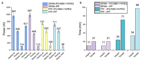For energy consumption measurements, the total value included energy needed for heating and, in some cases, cleaning, printing, and steady-state operation. The results depicted in Figure 11A were calculated depending on the time required to print one part and using Equation (1).