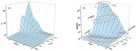 Figure 4b, for the same hybrid systems as previously, include four distinct relaxation processes, which become apparent via the formation of loss peaks. From the low- to the high-frequency region, the relaxations are ascribed to interfacial polarization (IP), also known as Maxwell–Wagner–Sillars phenomenon, glass-to-rubber transition (denoted as α-relaxation), local reorientation of small polar side groups of the main macromolecular chain (denoted as β-relaxation), and rearrangement (“crankshaft rotation”) of small flexible parts of the main polymer chain (denoted as γ-relaxation). The IP and α-process are characterized by longer relaxation times, while the local motions of the β- and γ-processes are faster, corresponding to shorter relaxation times.
