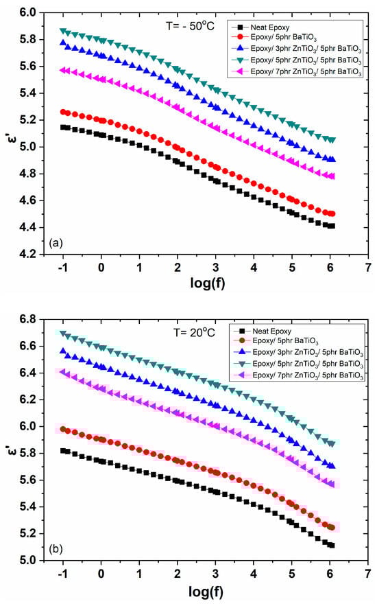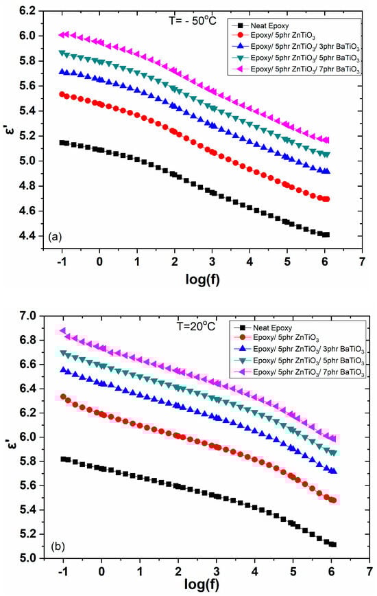 ε’ as a function of frequency at −50 and 20 °C is shown for the systems with a constant BaTiO