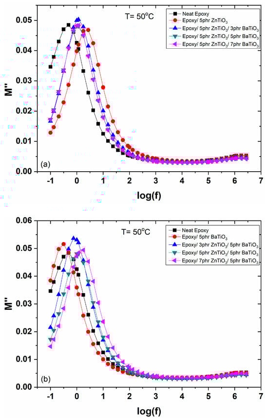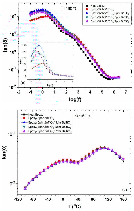 3 content. Interestingly, the loss peak of the nanocomposite with only zinc titanate filler shifts to higher frequencies with respect to the neat epoxy matrix, while as the content of barium titanate increases, the α-loss peak moves backwards to lower frequencies.