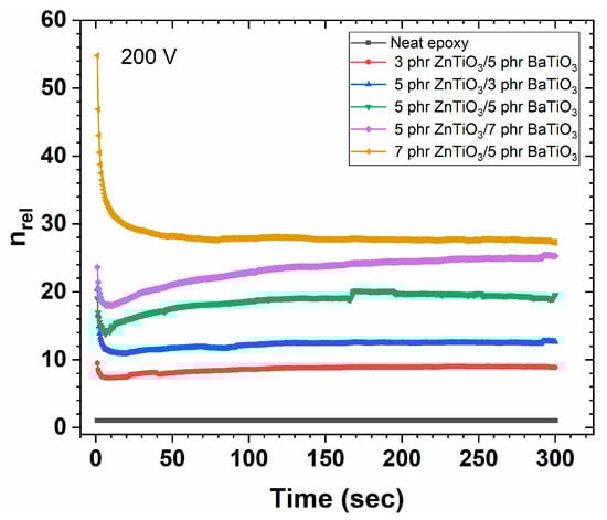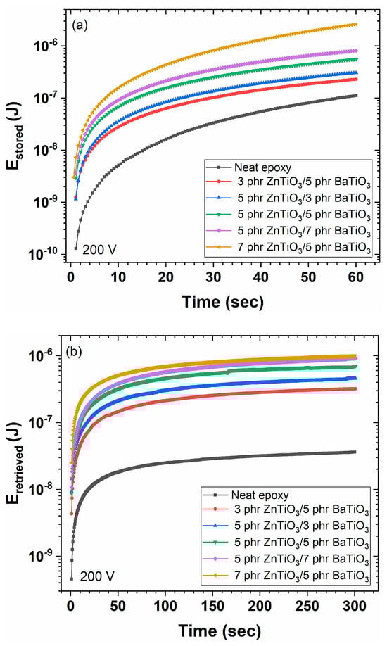 Figure 10a,b, the stored and retrieved energies for hybrid nanocomposites, charged with 200 V, are depicted. In all cases, the stored and retrieved energy increases with the filler content. Interestingly, in the cases where the sum of the ZnTiO