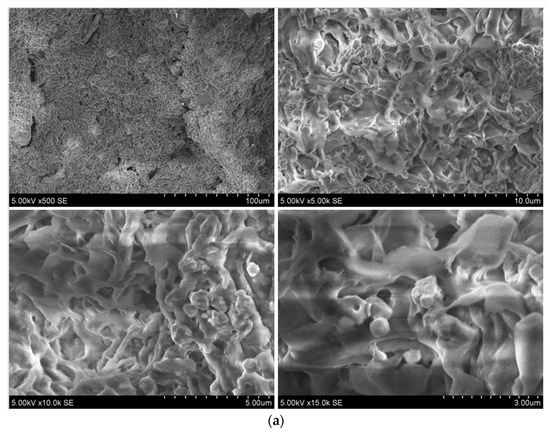 Scanning electron microscopy (SEM) allowed us to perform careful analysis of the distribution and dispersion of hydroxyapatite (HA) particles within the composite matrix, made up of polylactic acid (PLA), polyhydroxyalkanoates (PHA) and poly(3-hydroxybutyrate). The SEM images were captured at varying magnifications (500, 5000, 10,000 and 15,000 times the standard electron microscope resolution) (Figure 6). Obtained results demonstrated the uniformity of HA particles and shed light on how they were arranged spatially within the matrix. The arrangement of those particles resulted in structural reliability and increased bioactivity. Moreover, obtained SEM images showed particle distribution, providing a view of how HA and the polymer matrix interact, illuminating their compatibility and potential bonding. This property is crucial because a harmonious interface is a key factor in the successful incorporation of bioactive materials within the composite scaffolds. Effective compatibility can lead to improved scaffold bioactivity and osteoconductivity and those factors are vital for tissue-engineering applications.