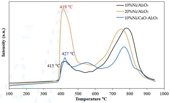 The reduction behavior of the Ni catalysts was analyzed by using H2-TPR characterization (Figure 1). The H2-TPR profiles of 10%Ni/Al2O3, 20%Ni/Al2O3 and Ni/CaO-Al2O3 show two reduction peaks. The reduction peaks at low temperature are ascribed partly to nickel species weakly interacting with the support. The first reduction peak shifts downward to 415 °C for 10%Ni/Al2O3, indicating that the reduction of Ni2+ to Ni0 becomes easier, whereas the active Ni component in the 20%Ni/Al2O3 and Ni/CaO-Al2O3 catalysts is more difficult to reduce. On the other hand, the reduction peaks at about 750–800 °C are attributed to the reduction of Ni2+ in the NiAl2O4 phase or nickel interacting strongly with the support [15,16,17]. A stable structure of the NiAl2O4 spinel phase results in difficulty in reducing it to Ni0 at low temperatures. The second reduction peak of 10%Ni/Al2O3 shifts to a high temperature compared to the other catalysts. The higher reduction temperature of the 10%Ni/Al2O3 catalyst suggests that it possessed a strong metal–support interaction (SMSI), which is beneficial to prevent the sintering of Ni and maintain the small particle size of Ni during the reduction process at a high temperature.