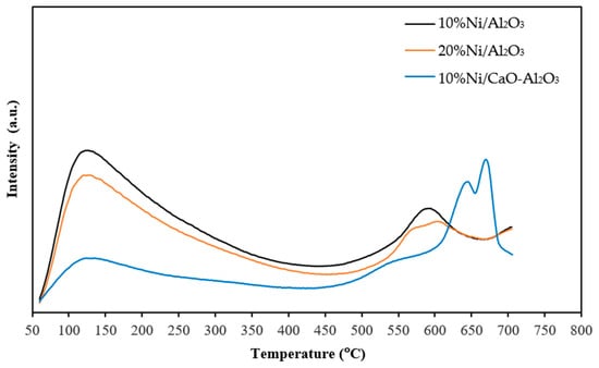 The surface acidity of the Ni catalysts was investigated by NH3-TPD (Figure 2, and the total acidity was calculated from the area under the desorption peak (Table 2. The effect of the acidity of the catalysts on the WGS performance was analyzed by using NH3-TPD. The desorption peaks in a temperature range of 50–400 °C or 500–700 °C are assigned to weak or strong acid sites, respectively. An enhancement of the acidity can increase CO adsorption on the catalyst surface because a CO reactant in the WGS reaction is a weak base. Furthermore, the surface acidity of the catalyst was proved to be beneficial for CO2 desorption, leaving behind free active sites for CO and H2O adsorption in subsequent reaction cycles [13,14]. The total acidity can be calculated by integrating the NH3-TPD curves. The result indicates that 10%Ni/Al2O3 exhibits the highest content of weak acid sites (178.2 μmol/g), which results in a higher tendency for CO adsorption and subsequently easier CO2 desorption on the 10%Ni/Al2O3 catalyst; thus, the overall WGS rate of this catalyst can be enhanced.