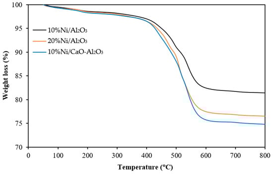 Thermo-gravimetric analysis (TGA) was used to determine the carbon deposition of the used catalyst (Figure 3). High temperature oxidation of carbon material in air leads to a weight reduction in the catalyst. Small weight loss at a temperature below 200 °C is due to the removal of moisture and volatile species [18]. The weight reduction in the range of 200–400 °C is related to the thermal decomposition of physisorbed carbonaceous species. A major mass loss of a range of 400–600 °C is ascribed to the bulky carbonaceous products on the used catalysts. The mass loss of the bulky carbonaceous species on Ni catalysts on different supports (Al2O3 and CaO-Al2O3) and Ni loadings (10% and 20%) were 22%, 20% and 15.5% for Ni/CaO-Al2O3, 20%Ni/Al2O3 and 10%Ni/Al2O3, respectively. Thus, the 10%Ni/Al2O3 catalyst after the WGS reaction test gives lower carbon deposition than other catalysts, thus obtaining higher efficiency and a higher WGS rate. For the spent 10%Ni/Al2O3 catalyst, the mass loss was significantly decreased. The better anti-carbon deposition performance of the 10%Ni/Al2O3 catalyst is attributed to the smaller size of nickel particles, as well as strong metal–support interaction.