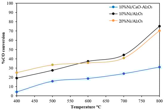 Figure 4 illustrates the %CO conversion of Ni/CaO-Al2O3, 10%Ni/Al2O3 and 20%Ni/Al2O3. For Ni/CaO-Al2O3, the CO conversion ascended slowly to reach the maximum of 31%CO conversion at 800 °C. As shown, the highest WGS activity was attained over the 10%Ni/Al2O3 catalyst, reaching 75% of CO conversion at 800 °C, which was due to its high Ni dispersion (6.74%) and surface acidity. A higher Ni dispersion with more surface-active sites are exposed to the CO reactant. The surface acidity is related to the amount of CO adsorption because a CO reactant in the WGS reaction is a weak base. Generally, the redox mechanism is accepted for the water–gas shift reaction at high temperatures where a carbon monoxide molecule adsorbs on the catalyst surface and abstracts one O from the metal oxide support to generate CO2. A depletion of oxygen from metal oxide is fulfilled by dissociating a H2O molecule and then desorbing as H2 gas, while O atom is captured by the oxygen deficient metal oxide [19]. Therefore, higher CO adsorption ability and easier reducibility result in a high WGS performance.