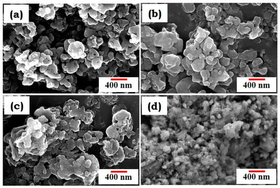 Figure 1 shows the surface morphology of undoped (Figure 1a) and Cu-doped BBG (Figure 1b–d). The particle size of BBG was around 100–200 nm in its undoped form, and the particle size was slightly reduced with copper concentrations in Figure 1b,c. Further, a higher Cu dopant concentration resulted in substantially smaller particle sizes (Figure 1d). The reduction in the particle size of BBG and Cu-doped BBG is due to the dopant copper ions (Cu2+), which substitute host lattices (B2O3, MgO, CaO, and Na) and distort their lattice structures, resulting in a reduction in particle size variation with different concentrations of Cu [17].