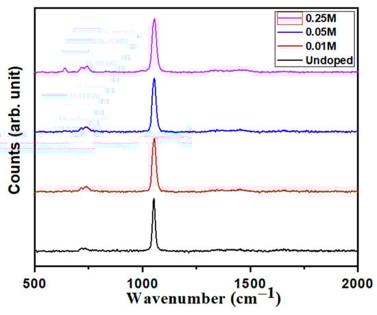 Raman spectra of BBG doped with different concentrations of Cu show distinct peaks corresponding to specific vibrational modes within the glass network (Figure 2). The prominent peaks at 1053 cm−1 for undoped, 0.01, 0.05, 0.25, and Cu doping suggest the presence of B-O stretching vibrations in borate triangles or tetrahedra, potentially driven by the creation of Cu-O bonds or alterations to the borate network produced by copper [18]. The strong peak around 1053 cm−1 remains consistent throughout doping levels, including 0.25% Cu, indicating the presence of a stable structural motif, probably a Cu-B-O complex. The presence of a peak at 1053 cm−1 in all BBG samples suggests an unchanged borate network structure. These findings provide significant insight into the structural changes caused by copper doping in the BG network, allowing for a better understanding of the composition–structure–property relationship [18,19,20].