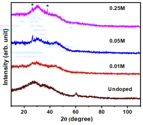XRD structural modification and treatment elucidation analysis with different dopings of copper. * indicates peak positions.