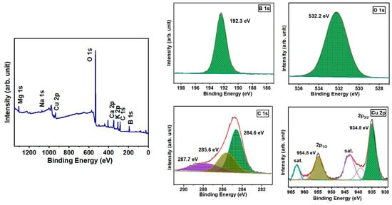 The X-ray photoelectron spectroscopy (XPS) technique was employed to determine the chemical state of copper (Cu) in the doped borate bioactive glass (Figure 4). From the survey spectrum, all the elements (Na, K, Cu, B, Mg, Ca, and P) were detected. The concentration of doped copper in the glass was found to be 1.8 atomic percent using the survey spectra. The measured binding energies of B and O were found to be 192.3 eV and 532.2 eV, respectively [26]. The high-resolution spectra of Cu 2p analysis revealed distinct doublet peaks at energy levels of 934.8 eV and 954.8 eV. These peaks correspond to the Cu2+ 2p3/2 and Cu2+ 2p1/2 states, respectively [27]. Two prominent satellite peaks, distinct from the Cu peaks, were observed at 942.9 eV and 962.9 eV. The presence of these additional peaks in the satellite spectrum can be attributed to the 2p03d9 electronic arrangement of Cu2+ in the CuO phase [28]. The difference in binding energy between spin orbits was 20 eV, which closely agreed with the previously reported values [27].