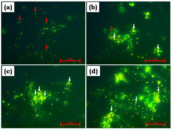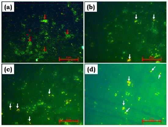 Figure 5 and Figure 6 show epifluorescence microscopy images of E. coli and S. aureus in undoped and Cu-doped BBG. The image clearly shows that green fluorescence was observed in undoped BBG for both E. coli and S. aureus bacterial strains (white arrow), indicating minimal antibacterial activity. Furthermore, the addition of Cu to BBG lowered the survival rate of both bacterial strains over time. Figure 5 and Figure 6b–d, exhibit primarily orange fluorescence, indicating bacterial death (E. coli and S. aureus). Cu influences the loss of membrane potential of the bacterial cell wall, resulting in the denatured state of proteins, amino acids, and DNA damage [29,30].