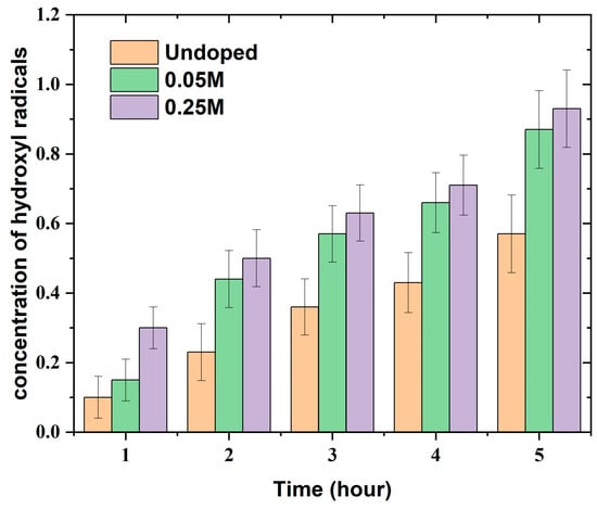 Figure 7 demonstrates an increase in hydroxyl radical generation over time for all tested samples (undoped, 0.25 M Cu, and 0.05 M Cu). All samples of BBG have the property of generating OH radicals. While increasing the molarity of Cu, there is an increase in the OH concentration and ultimately a decrease in the growth of bacteria due to changes in cellular permeability. Notably, the rate of increase appears highest for the 0.25 M Cu-doped sample, followed by 0.05 M Cu and undoped samples. This suggests that a higher concentration of Cu (0.25 M) may accelerate hydroxyl radical formation. Mu et al. (2022) identified highly oxidative hydroxyl radicals (OH•) produced at normal temperatures, and their continuous synthesis can lead to the spontaneous oxidation of Cu ions [31]. This process might influence cellular membrane permeability and potentially contribute to further radical generation [11,31]. Bhattacharya et al. reported that BBG glasses inherently release OH radicals [13]. The observed antibacterial activity of Cu-doped BBG could be attributed to the combined effects of Cu-mediated hydroxyl radical generation and the inherent release of OH radicals from the BBG itself.