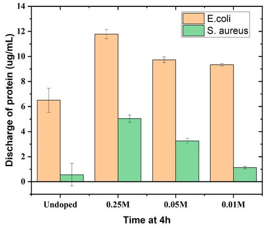 We examined the protein efflux capabilities of borosilicate glasses doped with various Cu concentrations for possible biomedical applications. CuNO3 solutions at concentrations of 1 mg/mL (0.01, 0.05, and 0.25 M) were added to a 24 h culture of E. coli and S. aureus bacteria. The centrifugation process was used to separate the proteins produced by the bacterial cells following a 4–5 h incubation period at 37 °C. The extracted proteins were subjected to the Bradford assay, with absorbance measured at 595 nm after 10 min of incubation in the dark.