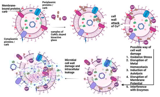 The primary and essential characteristics of any synthesized biomaterials are their antibacterial capabilities and improved biomaterial surface qualities for long-term life. Several strategies are designed to work together with all attributes to improve materials’ physiochemical and biological properties. The addition of therapeutic ions such as Cu into bioactive glass composition improves its intrinsic capabilities by disturbing the plasma membrane, modulating oxidative processes, causing DNA damage, and so on [8,9].