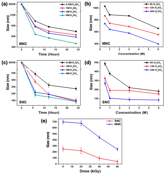 DLS analysis of the size of NC according to processing time, acid concentration, and dose of E-beam. MNC based on (a) processing time and (b) acid concentration; SNC based on (c) processing time and (d) acid concentration; (e) E-beam- and Mo-Ac-treated SNC and MNC under the optimal condition.