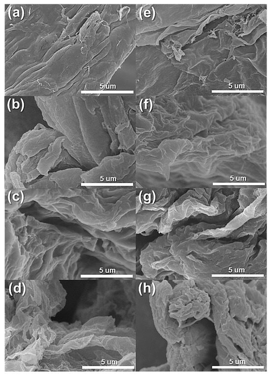 SEM images of microcrystalline cellulose (MC) and EtOH-washed seaweed (Et-SW) irradiated with different E-beam doses: MC at (a) 0 kGy, (b) 20 kGy, (c) 40 kGy, (d) 60 kGy; Et-SW at (e) 0 kGy, (f) 20 kGy, (g) 40 kGy, (h) 60 kGy.
