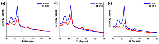 Crystalline structures play an important role in determining the physical and mechanical properties of composite films. XRD analysis, as presented in Figure 4, shows the crystallinity properties of MNC and SNC depending on the E-beam irradiation dose after Mo-Ac treatment under optimal conditions. All SNC samples exhibit an intense peak with a double peak signal between 15° and 20°. In contrast, MNC has a single peak signal between 15° and 20°. These results suggest that MNC has lower crystallinity and the presence of an amorphous region. Additionally, the peak at 23.6° became slightly narrower with increased intensity at an E-beam dose of 40 kGy than that at 20 kGy, implying the effective decomposition of the amorphous structure without collapsing the crystal structure. However, the overall intensity of the peaks decreased significantly at an E-beam dose of 60 kGy, indicating the collapse of the structure due to the high dose of E-beam irradiation. Thus, the optimal E-beam dose for isolating NC without a major collapse in the crystallinity of cellulose was noted to be 40 kGy [38].