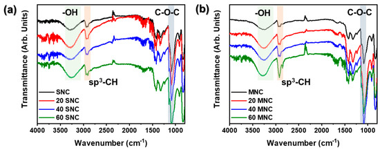 The FT-IR spectra in Figure 5 illustrate the chemical structure changes in SNC and MNC pretreated with different E-beam doses. Noticeably, the intensity of the band corresponding to the -OH groups (green shaded area, 3200~3500 cm−1) slightly increases and broadens with an increasing E-beam dose. Moreover, the shape and intensity of the sp3-CH band (orange shaded area, 2800~3000 cm−1) and C-O-C stretching (gray shaded area, 1050~1150 cm−1) are more clearly deconvoluted and increased. These results confirm that NC prepared by E-beam pretreatment was effectively obtained without significant changes in the chemical structure [39,40].