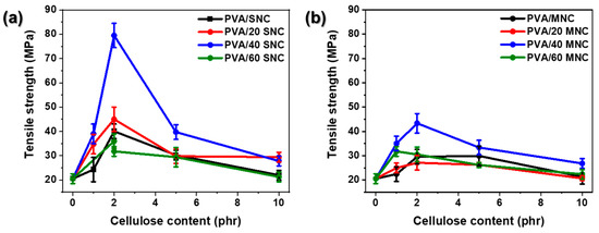 Tensile strength of the PVA composites with 1, 2, 5, and 10 phr of (a) SNC and (b) MNC.