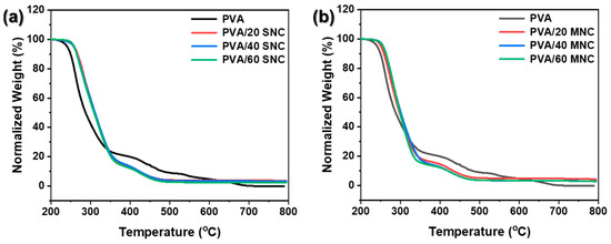 As shown in Figure 7, the thermal stability of the PVA composite with NC upon E-beam irradiation was obtained using TGA. TGA analysis reveals the enhanced thermal stability of the PVA composites with E-beam-treated SNC and MNC. Compared to pure PVA film, all PVA composites achieved superior thermal stability. Both types of NC improved the thermal stability with increasing E-beam doses, whereby the largest enhancement was obtained with the E-beam doses of 40 kGy. This suggests that the E-beam treatment facilitated the dispersion and interactions between the NC and PVA matrix, thereby increasing the thermal stability of the composites.