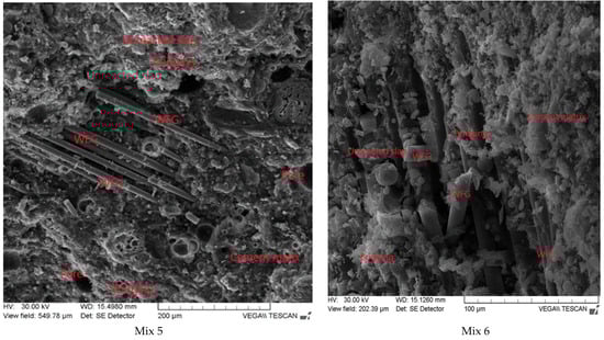 Fiberglass has a positive effect on the mechanical properties of concrete but can reduce workability. The length, diameter, and quantity of fiberglass added are significant factors that affect the workability. Fibers can lead to a higher water demand to achieve the same workability as reference concrete [48]. Table 10 shows that the addition of WFG also reduced the mixtures’ workability, in accord with the literature [49]. The decrease in workability was probably caused by the dry glass fiber fluff absorbing the mix water. Consequently, a vibration table was used for compaction. The workability decreased from 70 mm at 20 mm, respectively, to 10 mm for samples that contained WFG, but all of the composite mixtures were sufficiently workable to be cast into the molds.