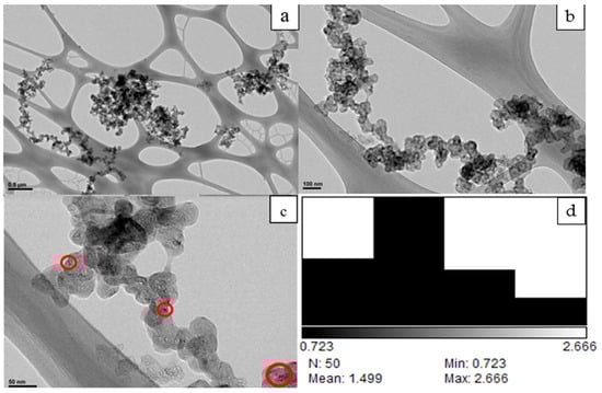 The TEM micrographs in Figure 1 show the mesoporous carbon embedded with palladium nanoparticles (Pd-MCM). No individual palladium nanoparticles could be observed in Figure 1a or Figure 1b; however, in Figure 1c incredibly small nanoparticles can be seen and several examples are circled. The transmission electron microscopy (TEM) images depicted in Figure 1 offer a detailed depiction of the structure of the mesoporous carbon matrix integrated with palladium nanoparticles, denoted as Pd-MCM. Upon examination of Figure 1a,b, individual palladium nanoparticles are not readily discernible. However, in Figure 1c, the magnified view reveals the presence of nanoparticles, with several instances highlighted by encirclement. These nanoparticles hold significant importance within the composite material. Their incorporation into the mesoporous carbon matrix imparts catalytic functionality to the Pd-MCM composite. These nanoparticles serve as active sites for catalytic reactions, facilitating the transformation of reactant molecules into desired products. The circled examples in Figure 1c underscore the presence and distribution of these crucial nanoparticles within the composite structure. Their observation corroborates the successful synthesis of the Pd-MCM composite and validates its potential for catalytic applications. The cumulative effect of these nanoparticles within the composite matrix is instrumental in driving catalytic activity, exemplifying the intricate interplay between structure and functionality in nanomaterial-based catalysts. The method used to synthesize these PdNPs has been previously used by this team and it was found that the nanoparticles generally range in size from 2 to 4 nm in diameter, while Figure 1d indicates the nanoparticles were smaller in this study with an average particle size of 1.5 nm in diameter [28]. Figure 2a shows the SEM micrographs of the Pd-MCM at a scale range of 0.5 micron. Two incredibly large spots can be seen having diameters around 2 microns and much smaller spots can be seen scattered throughout the image. It is likely that these two large spots are agglomerations of nanoparticles. Figure 2b depicts elemental analysis of the SEM micrograph, focusing on the large spots, confirming their identity to be palladium, which supports the agglomeration theory.