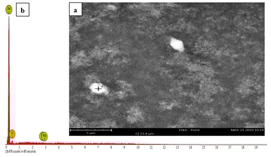 To determine the elemental composition of the nanocomposite material, Scanning Electron Microscopy (SEM, JEOL JSM-6060LV, JEOL, Akishima, Tokyo, Japan)/Energy Dispersive Spectroscopy (EDS, Thermo Scientific UltraDry, Thermo Fischer Scientific, Waltham, MA, USA)) was used. A powdered nanomaterial was placed on a sample holder and analyzed.