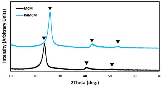 P-XRD Spectra for the Pd-MCM catalyst. Triangles indicated the characteristic peaks of the MCM backbone.