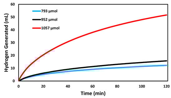 Before different trials were tested, a set of trials was run at 295 K, pH 7, and using 952 μmol of NaBH4. These trials then became the standard for comparison for all the other reaction conditions. At the standard conditions, after two hours, this reaction produced on average 15.8 mL of hydrogen. The first conditions tested were varying concentrations of NaBH4 as seen in Figure 4. When tested at 793 μmol, deemed low concentration, it was observed that there was less total volume of hydrogen produced after two hours of 12.3 mL. High concentration (1057 μmol) had the opposite effect, with an increase in hydrogen produced up to 51.6 mL after two hours. These results show a positive linear relationship between the concentration of NaBH4 used and the volume of hydrogen produced. This result was expected as based on Equation (1), the equilibrium law states that the increase in NaBH4 would shift the reaction to the right, increasing the amount of hydrogen product.