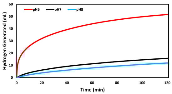 Standard conditions were tested against adjusting the pH of the reaction (Figure 5). When the pH was raised from 7 to 8, there was a decline in the amount of hydrogen produced to 12.0 mL. A lowered pH from 7 to 6 resulted in a marked increase in hydrogen generated, to 51.6 mL. The work of Schlesinger et al. in 1953 found that lowering the pH of this reaction results in an increase in the number of hydroxide ions in the reaction which results in more hydrogen released [31].