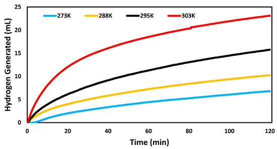 Figure 6 shows the results of the catalytic ability of Pd-MCM when tested at different temperatures. A clear direct relationship between temperature and hydrogen produced was observed with 273 K producing the least amount of hydrogen at only 6.8 mL. At 288 K the volume of hydrogen produced was more than 273 K but still less than 295 K with 10.3 mL. Raising the reaction temperature to 303 K resulted in an average volume of 23.1 mL generated. Based on these results, the equilibrium law, and Equation (1) this reaction was determined to be endothermic.