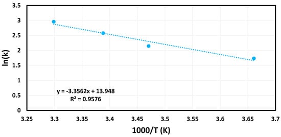 In Equation (2), the variables are as follows: k is the reaction rate, A is the preexponential constant, Ea is the activation energy, R is the universal gas constant, T is the temperature the reaction was tested at. Based on the equation of the line from the Arrhenius plot (Figure 7) the activation energy of the reaction as catalyzed by Pd-MCM was calculated to be 27.9 kJ mol−1. This activation energy was then compared against other catalysts for this reaction as seen in Table 1.