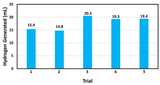 Figure 8 illustrates the results of these reusability trials, revealing the consistency in the volume of hydrogen produced throughout the consecutive trials. There was a slight increase observed in hydrogen generation after the second trial, followed by a stable average hydrogen yield of 17.9 mL per trial. This trend suggests that the catalyst may have undergone activation after the initial trials, leading to enhanced catalytic performance. Such activation phenomena are consistent with previous findings reported by the research team of Deraedt et al. in 2014. Their studies suggested that the bonds present on the surface of palladium nanoparticles undergo hydrolysis over time, thereby increasing their catalytic activity [42,43,44,45].