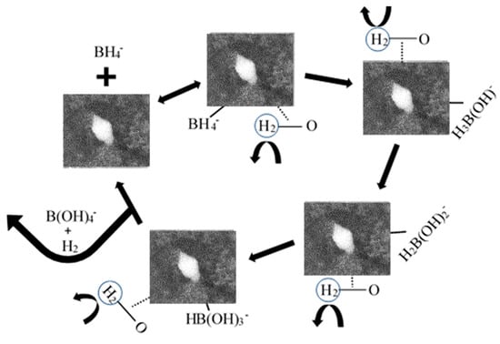 The process described above is repeated three additional times, each time producing one hydrogen molecule and resulting in the formation of a tetrahydroxoborate ion (B(OH)4−) as the final product. After the fourth cycle, the B(OH)4− ion dissociates from the Pd nanoparticle, freeing the catalytic site for a new borohydride ion to bind, thus allowing the cycle to repeat.