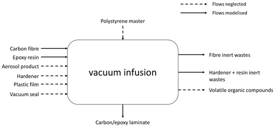 Boundaries of vacuum-infusion process studied in this LCA. The dotted-line flows were neglected in this analysis. The continuous-line flows constitute the source of impacts in this analysis.