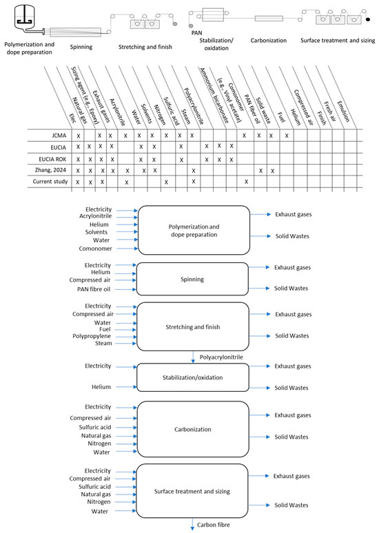 Comparison of flows suggested in the current inventory and the literature using experimental but unusable data ([20,21,22,23]). Carbon-fibre manufacturing process steps are illustrated, as well as flows under study. A comprehensive flowchart based on information from the literature is presented.