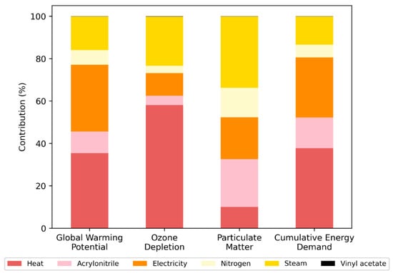 Acrylonitrile was also included. In fact, this flow is always considered, because it is part of the PAN flow in the EcoImpactCalculator [21,22]. Nitrogen was considered by the JCMA study [20], but no other ones. Steam was considered in the JCMA [20] and Zhang [23] studies, but not in the EcoImpactCalculator [21,22]. Vinyl acetate has been included in this inventory, but hot-spot analysis has revealed that it induces negligible impacts.