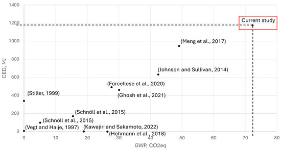 GWP and CED results determined by calculation, the literature, or expert estimation ([10,13,15,29,30,31,32,33,34]), compared to the current study. Technical reports are reported with author(s) name(s) and year of publication.
