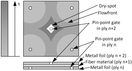 In many studies, the laminate is impregnated in the thickness direction. The metal foils represent a barrier to the resin flow and must therefore be perforated. Consequently, a system of pin-point gates forms in each layer of fiber material. Viewed in cross-section, the holes in the metal foils are usually staggered [14,15,16] so that no dry-spots can form when the flow fronts merge and the trapped gas can escape to the next higher layer (see Figure 1).