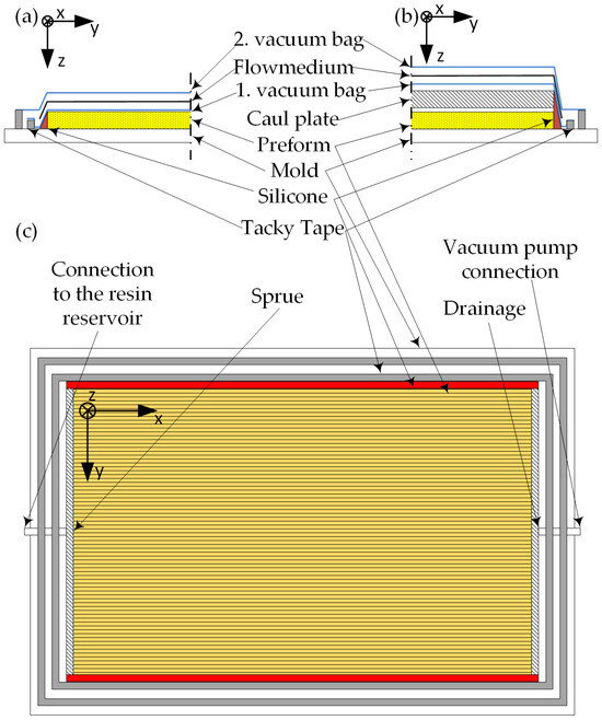 The reason for the difference lies in the compaction of the fiber material during infusion (see Figure 12). Without a caul plate, the fiber material is compressed more at the flow front (transition between the saturated and unsaturated area), thus reducing the permeability. During infusion, the pressure within the cavity initially increases in the sprue area. As the pressure difference between the pressure in the cavity and the ambient pressure thus decreases, the cavity height in this area increases [25]. If a caul plate is used which has a high flexural rigidity, the cavity height is increased over the entire cross-section (in the flow direction of the resin). This reduces the compaction of the fiber material and increases the permeability [26,27].