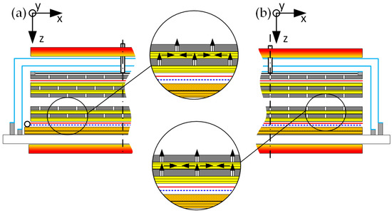 Figure 3 shows the laminate structure in cross-section for out-of-plane infusion. In Figure 3a, the holes in the plates are offset and in Figure 3b, the holes are aligned with each other. In addition to the laminate structure, the resin flow for the two variants is also indicated with arrows. The resin flows through the holes and this results in many individual pin-point gates for the individual plies. If the holes are staggered, the idea is that the residual air can escape through the hole to the next higher ply (Figure 3a). In the other variant (Figure 3b), the pressure gradient should ensure that the residual air or the formation of voids is prevented.