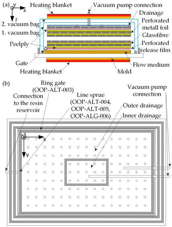Figure 4 shows the schematic experimental set-up for the out-of-plane infusion experiments. In the tests with alternating holes, three different test set-ups are investigated to achieve the goal of complete impregnation of the laminate. For test OOP-ALT-003, a ring gate (PE-spiral tube ID 9 mm, Time Out Composites, Bornheim-Sechten, Germany) is used around the laminate. For test OOP-ALT-004, a line sprue is applied. In both trials, two layers of flow medium are positioned underneath the laminate. A perforated release film (Nowoflon ET-6235Z, Nowofol, Siegsdorf, Germany) is used for easy separation between the component and the flow medium (Flonet 112 g/m2, Pultex, Simmerath, Germany). The peel ply (Stitch Ply A, Airtech, Differdange, Luxembourg) protects the laminate and sets a defined surface roughness on both sides. The drainage is formed from a perforated cover sheet, breather (Airweave N10, Airtech, Differdange, Luxembourg), vacuum bag (WL600V, Airtech, Differdange, Luxembourg), and tacky tape (GS-213-31/2, Airtech, Differdange, Luxembourg). For this purpose, tacky tape is stuck along the edges of the perforated cover sheet and the area between the tacky tape is filled with breather (outer drainage). In the middle area of the perforated caul plate, additional tacky tape is stuck in a rectangle to create an inner drainage. This area is also filled with breather. A vacuum line is provided for both the inner and outer drainage, which are connected to the vacuum pump. A vacuum bag seals the drainage together with the tacky tape and thus prevents the resin from penetrating into the drainage from the side. The use of an outer and inner drainage prevents the resin from spreading too quickly in the breather and the laminate from being additionally impregnated from the top side.