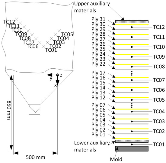 Schematic illustration of the experimental setup for the temperature distribution experiments. Lower auxiliary materials: two-time flow medium, perforated release film, and peel ply. Upper auxiliary materials: peel ply, caul plate (steel 0.4 mm), and breather.