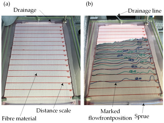 (a) Experimental set-up for in-plane infusion. (b) Progress of the flowfront.The red lines mark the distance to the sprue line and have a distance of 50 mm.